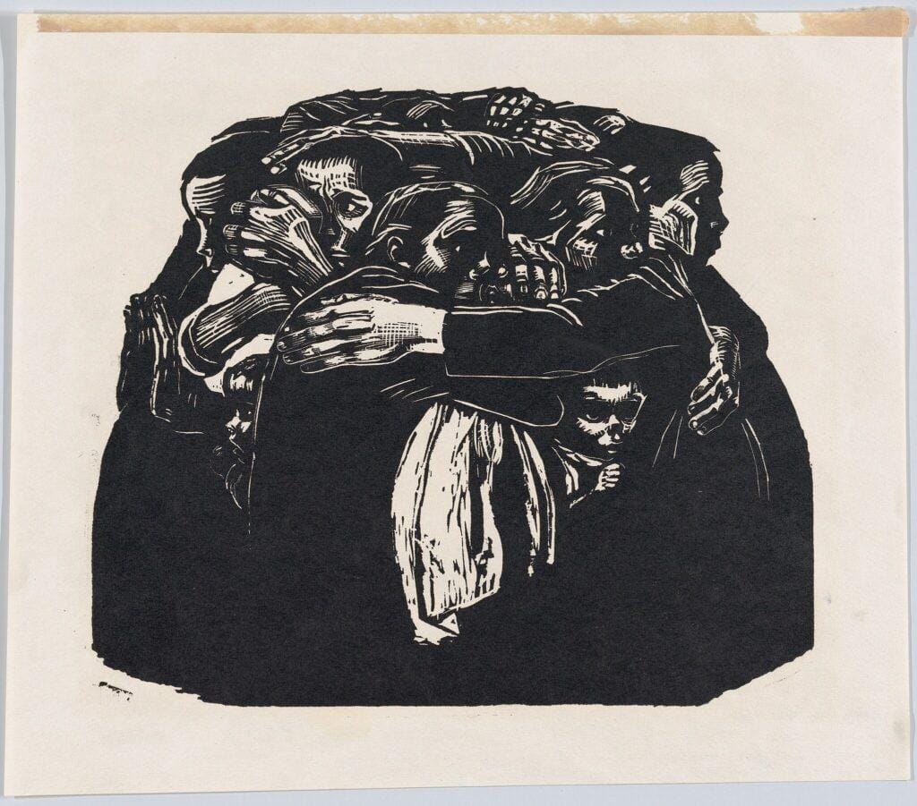 The people suffering most from this conflict are, of course, the people in Iran and elsewhere in the region experiencing devastating barrages of missiles and drones. This is highly industrialised warfare conducted at a distance, and the sense of terror is unimaginable for people like me. The first relatively industrialised war was probably a century ago with WWI. Beyond its obvious horrors and geopolitical implications, this inspired artists like Käthe Kollwitz. She lost her son Peter in its early months. That loss and her broader anti-war convictions shaped much of her work. The image below is called The Mothers (Die Mütter) and is from a series of woodcuts entitled War. Kollwitz depicted the suffering of women, children, and civilians during conflict, showing the impacts of war beyond the Frontlines. In this picture, a group of women huddle together in mourning. Horrifyingly, I am afraid we will continue to see many such groups in photographs and on our television screens in the months ahead.